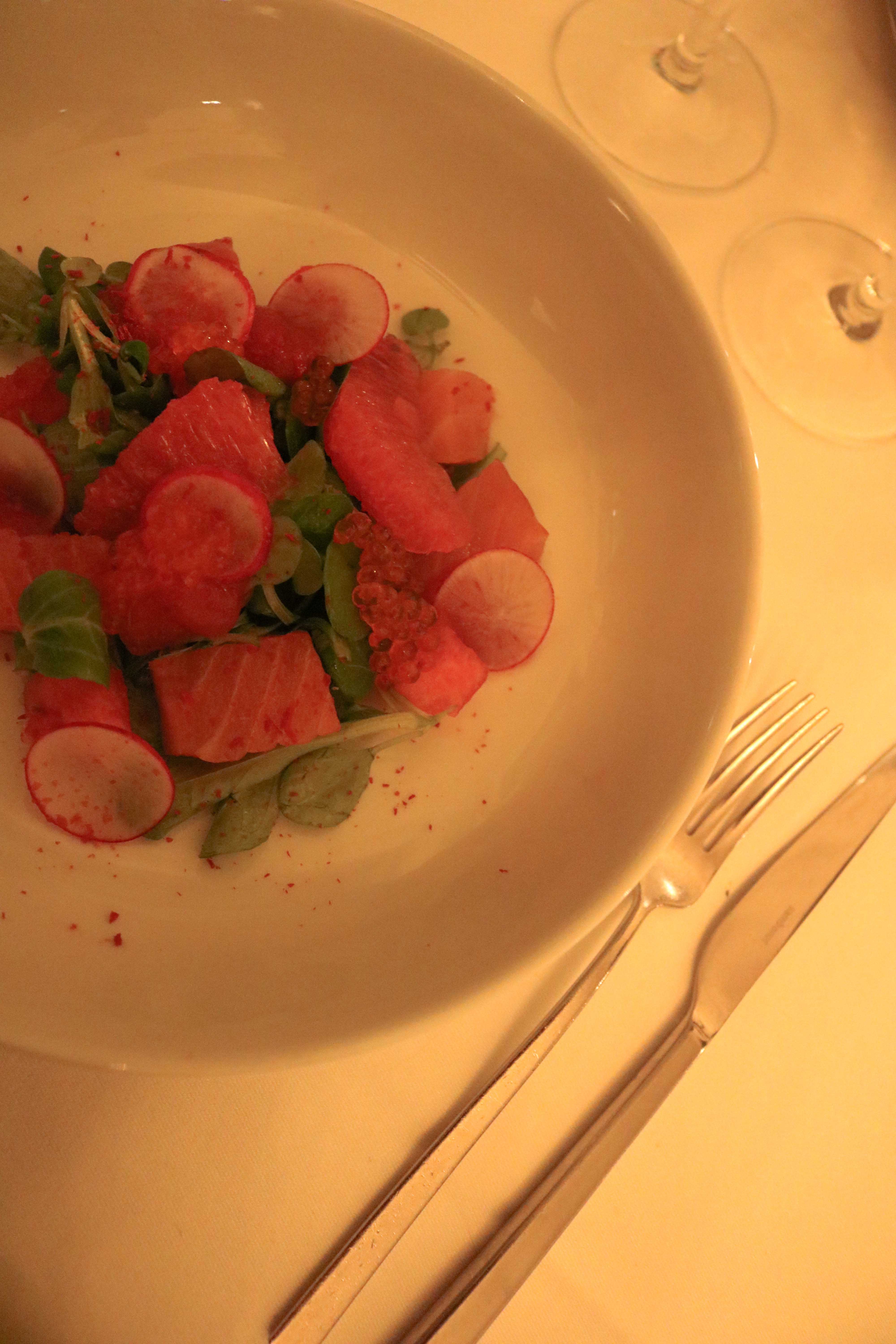 Het tweede gerecht vanavond is witlof met forel, beurre blanc en bottarga. Bij het horen van beurre blanc als onderdeel van mijn eten krijg ik het al Spaans benauwd. Met boter maak je mij namelijk echt niet blij. Ik ben dan ook een beetje huiverig wanneer ik mijn eerste hap neem. Gelukkig valt het reuze mee: ik herken subtiel de smaak van forel, de witlof is zacht en smaakvol en het geheel wordt geserveerd in een romig sausje dat gelukkig niet te veel smaak van boter heeft. De bottarga – dat zijn geconserveerde viseitjes van Sardinië – ligt bovenop het gerecht en heeft een herkenbare structuur en smaak. Bij ons tussengerecht drinken we een witte wijn uit de buurt van Barcelona, deze is fris, bitter en heeft aroma’s van steenfruit.