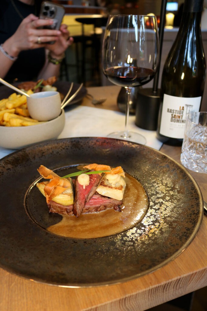 Voor het hoofdgerecht heeft de chef vandaag gekozen voor bavette die zó mals is gebakken dat hij wegsmelt op de tong. Geserveerd met zachtgegaarde pastinaak, artisjok, knapperige frietjes en een mooi gebonden, krachtige morillesaus. Van die laatste blijven we gulzig bijschenken totdat het kannetje leeg is en de frietjes op zijn.