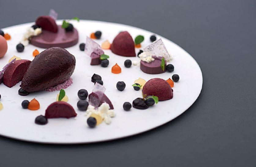 Op het andere bord geroosterde grietbot van superieure kwaliteit en versheid: een rijk gesorteerde begeleiding met tomaat als hoofdmotief, royaal gedecoreerd met zalfjes, crumbels en krokantjes. De sommelier bedacht de Soave van Roccolo Grossi la Broia van 2015 en dat blijkt wederom een prima keuze. Bij het nagerecht vormen zomerse wilde bosbessen het hoofdbestanddeel, ook in de vorm van een sorbet, terwijl het heerlijke vanille-ijs het bord compleet maakt. Het glaasje kersenwijn oogst 2016 van Wijndomein Hoenshof past er prima bij.