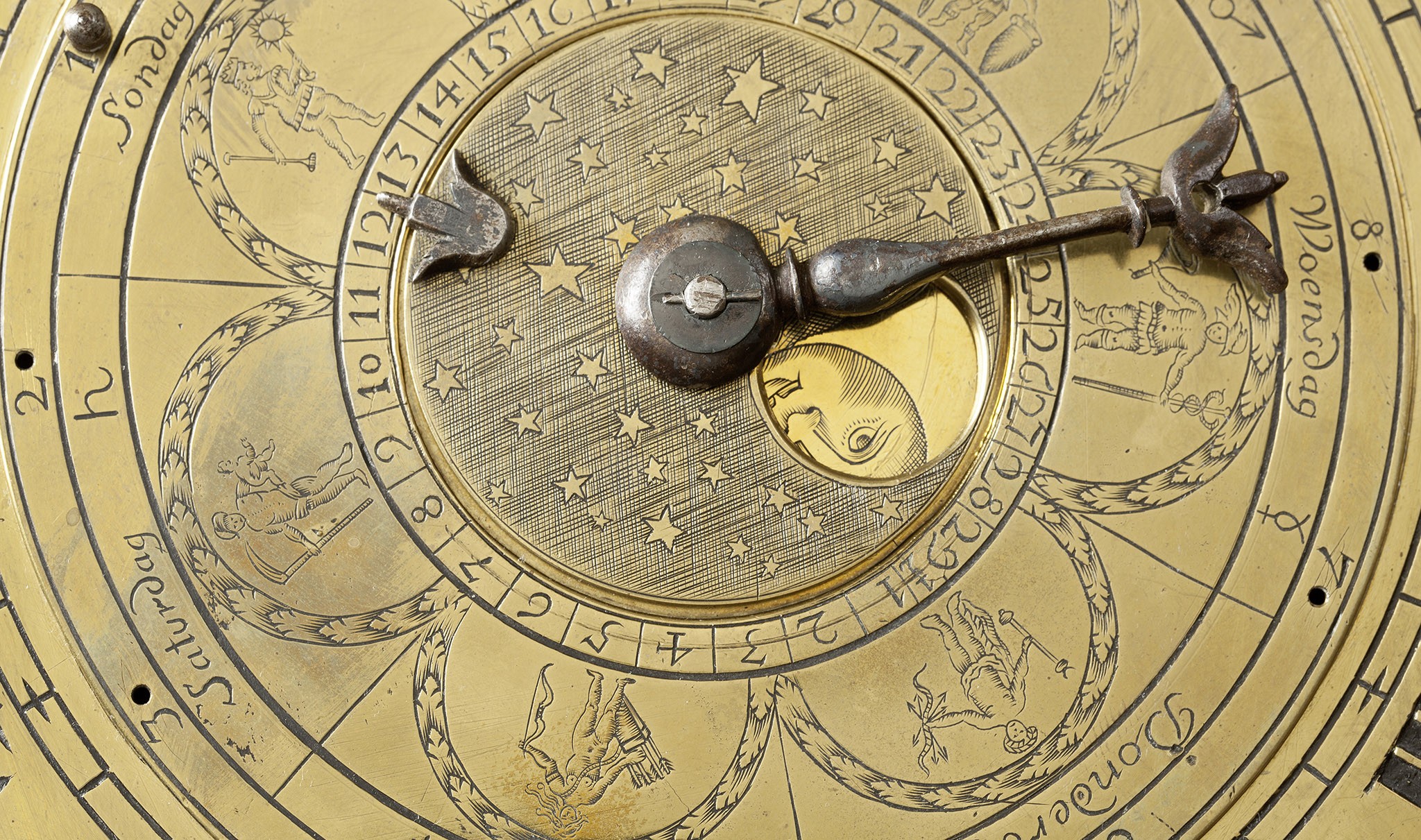 De lantaarnklok van Joannes Muijs was in zijn tijd een curieus uurwerk: de wijzerplaat omvat namelijk astronomische aanduidingen. De tijd wordt aangegeven door een ijzeren uurwijzer op een Romeinse cijferring, terwijl een andere wijzer de tijd aangeeft waarop de maan de meridiaan passeert. De maanfasen zijn tevens zichtbaar. Met een fijne hand zijn elegante figuren in het centrum van de wijzerplaat gegraveerd. Dit zijn personificaties van de dagen van de week, waarvan ook de namen en symbolen zijn weergegeven.
