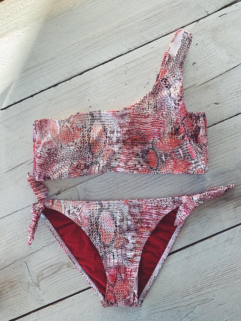 Asymmetrische mode zien we al een tijdje terug in de rekken. Dit jaar waagt voor het eerst ook de badmode zich aan deze terugkerende trend. Denk aan ruches die schuin over het badpak lopen. Of een bikini die voor de helft strapless is. We zien het in alle vormen en maten terug dit seizoen. Mijn favoriet is deze asymmetrische bikini van Cyell. Hij is kleurrijk, heeft een slangenprint (ook helemaal hot dit badmode seizoen) en is strapless aan een kant. Bovendien zit in de bikinitop een beugel die zorgt voor de nodige steun, wat deze bikini ook voor een (cup)maatje meer waanzinnig maakt.