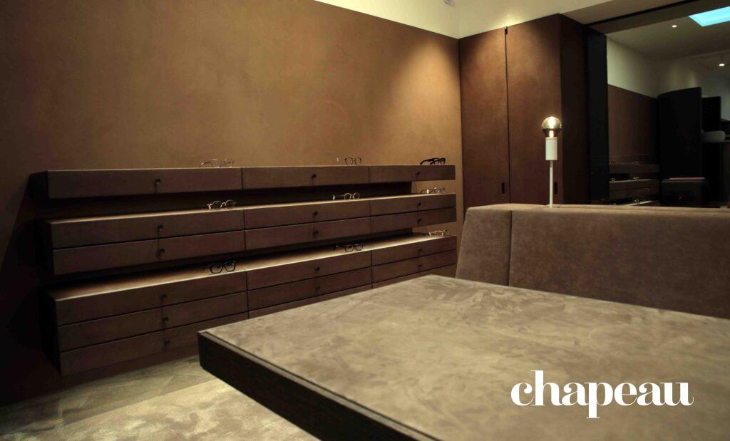 Zo vinden we in het voorste gedeelte van de zaak de werkplek, die als een soort open keuken wordt gepresenteerd. Hier hebben klanten direct aanspraak en kunnen ze meteen kennismaken met het ambachtelijke werk waar het familiebedrijf om bekend staat. De showroom van de zaak, direct achter de werkplek, staat volledig in het teken van individuele aandacht voor de klant. Er wordt slechts een summier gedeelte van de collectie gepresenteerd en er zijn twee keer zoveel pasplekken als voorheen. Verder achteraan zijn er extra meetruimtes en worden in 2026 twee nieuwe diensten toegevoegd aan het aanbod van MESTRINI: audiologie en kinderbrillen.