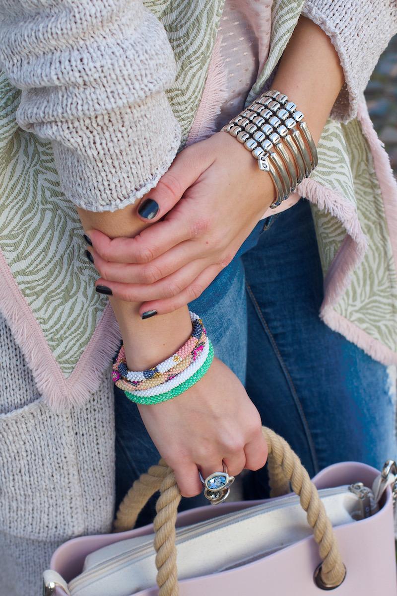 ‘Diamonds are a girls best friend’, wordt wel gezegd. En zo is het maar net! Beter weer betekent korte mouwen. Sieraden kunnen dan uitstekend gebruikt worden als eye-catcher van je outfit. Als het op sieraden aankomt mag je Mix & Match gerust toepassen. Denk aan verschillende soorten materialen, kleuren en vormen. Zoals je ziet heb ik gekozen voor verschillende stijlen qua armbanden en een ring. De gekleurde armbanden van het merk LOFFS sluiten perfect aan bij de outfit en geven de look een fris tintje. De zilveren grovere armband en de ring zijn van het merk UNO de 50, een trendy en opvallend merk. De ring bevat weer andere kleuren dan de armband, maar past nog steeds mooi in het geheel.