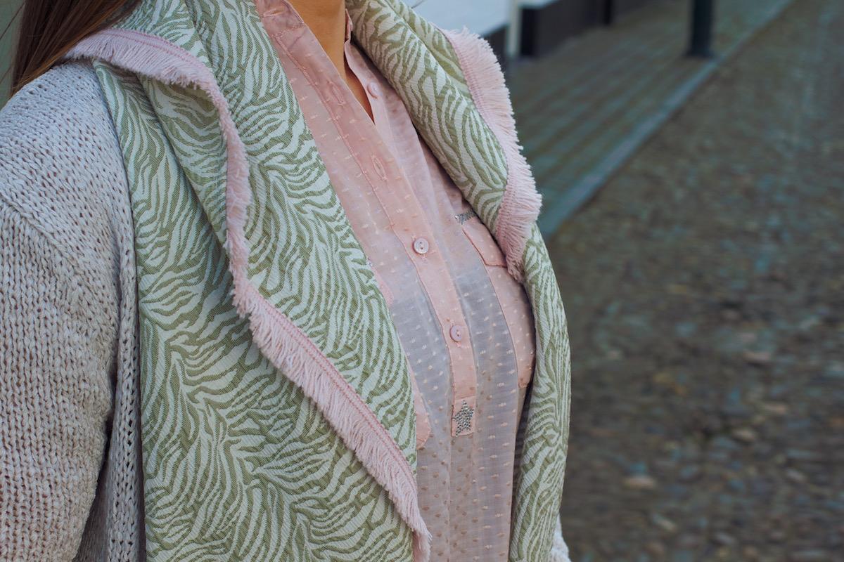 Misschien wel de meest voor de hand liggende Mix & Match is kleurgebruik. Vooral met de lente op komst kun je alle mooie pasteltinten mooi met elkaar combineren. Of dit nu blauw met paars is of in dit geval roze met groen. Alles kan en alles mag! Pasteltinten geven een echt lente-gevoel! Ik heb gekozen voor deze zalmroze blouse van Copenhagen Luxe, waarvan het roze terugkomt in de sjaal. Wel wordt hierdoor ook een extra kleur toegevoegd, namelijk lichtgroen in een soort van zebra-dessin. Door de kleur van de outfit licht te houden heb ik gekozen voor een crèmekleurig vest van het merk ZUSSS. Stijl de outfit af met een goede denim broek, zodat er een mooi contrast ontstaat in de lichte tinten en het fellere blauw. In principe kun je bijna niet de mist in gaan zodra je lichte tinten met elkaar combineert. Probeer het maar eens uit!