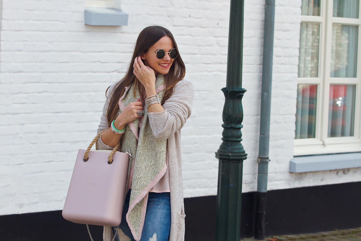 Materiaal is ook zeker weten een belangrijk onderdeel als het aankomt op Mix &Match. Door verschillende materialen met elkaar te combineren, kun je gemakkelijk met meerdere lagen werken. Zoals je ziet heb ik hier drie lagen kleding aan. De blouse en de broek is de eerste laag, daarna volgt het vest met daar overheen de sjaal. Alle items zijn gemaakt van ander materiaal. Wil je er nog een stapje bovenop doen? Dat kan. Zoals je ziet heb ik gekozen voor een tas van het merk O Bag. Deze tas bestaat uit twee verschillende soorten materialen die allebei nog niet terugkomen in mijn outfit. Je kunt het dus zo gek maken als je zelf wilt.