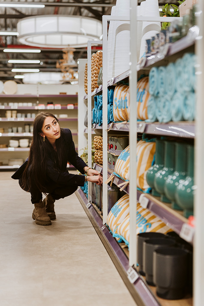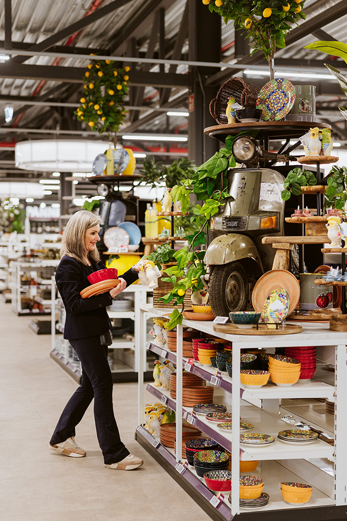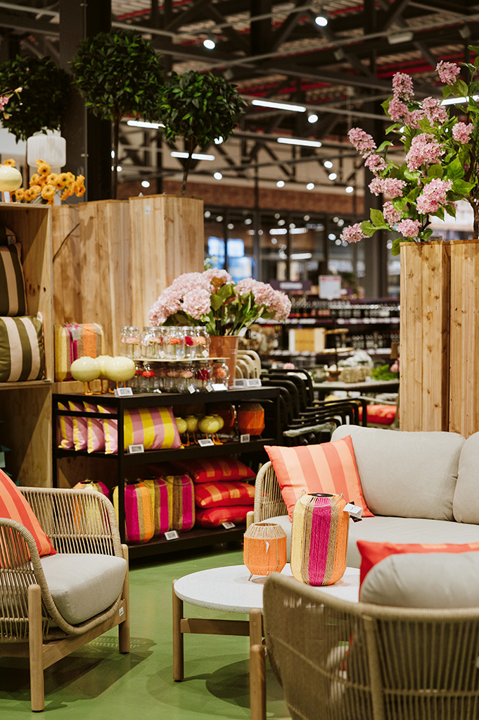 „We laten ons graag leiden door de seizoenen”, verduidelijkt styliste Kyra Notermans. „Het is heel leuk om op het Zomerplein een vakantie-vibe te creëren met bloempotten, tafellampen, parasols, kussens, BBQ-sets, noem maar op. We proberen een totaalconcept neer te zetten waarin alle elementen voor een geslaagde zomer samenkomen. Alles wordt gepresenteerd in een realistisch decor. Dat helpt om de juiste keuze te maken. Onlangs hadden we een Italiaanse themadag, waarop we met Vespa’s, pizza- en pastaborden, wijnglazen enzovoort een mediterrane sfeer creëerden.”