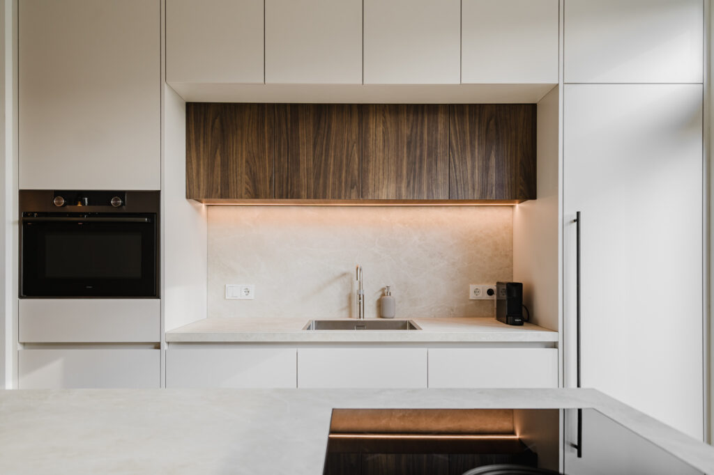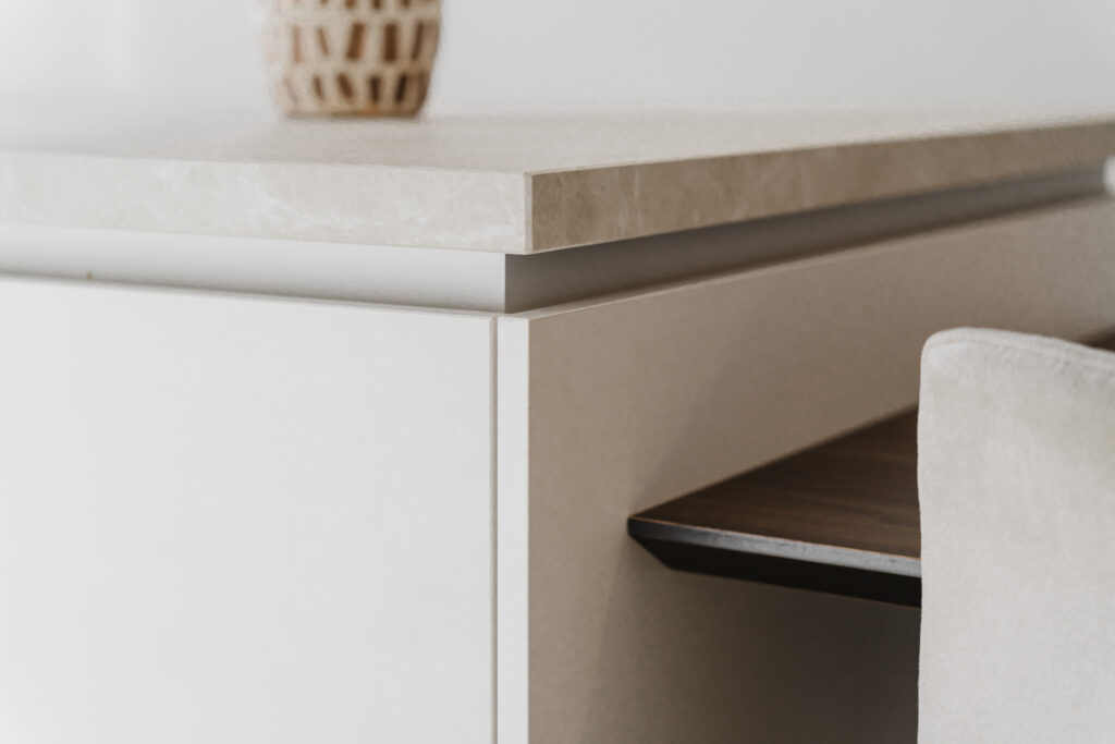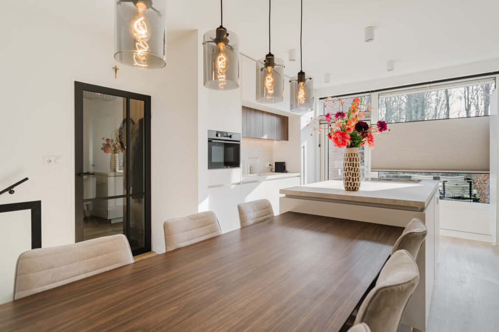Ook de keuken én eethoek zijn volledig op maat ontworpen. Van de indeling tot het materiaalgebruik – alles sluit naadloos aan bij de rest van het interieur. De keuken is een plek van ontmoeting, van samenzijn, van leven. Daarom is hij niet alleen mooi om te zien, maar ook functioneel tot in de details. De maatwerk eethoek vormt het hart van de woning – een warme, uitnodigende plek waar geleefd mag worden. Hier wordt gekookt, gelachen en gepraat.