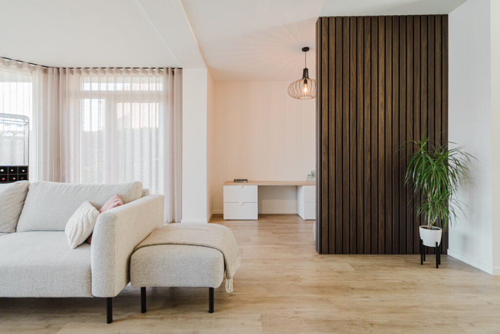 Aan de andere kant van de ruimte is het maatwerk doorgetrokken in een roomdivider. Niet zomaar een afscheiding, maar een slimme oplossing om het kinderhoekje subtiel aan het zicht te onttrekken. Zodat je wél het gevoel van openheid behoudt, maar toch duidelijke zones creëert in huis (en je je niet hoeft te storen als het even niet zo opgeruimd is…) En de achterkant? Die is voorzien van een prachtige kurkenwand – ideaal voor tekeningen, to-do lijstjes of gewoon als natuurlijke sfeermaker. Praktisch én stijlvol.
